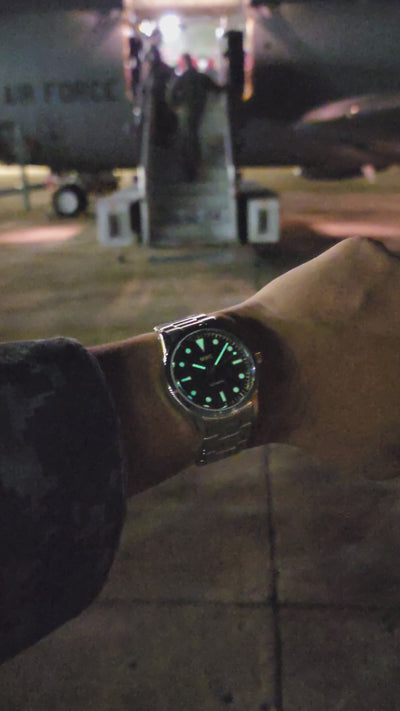 The watch uses Luminova instead of the Tritium used in the 1960s. The main advantage of Luminova is that it does not deteriorate with age and is non-radioactive. In this variant, the paint color mimics the appearance of aged Tritium paint.